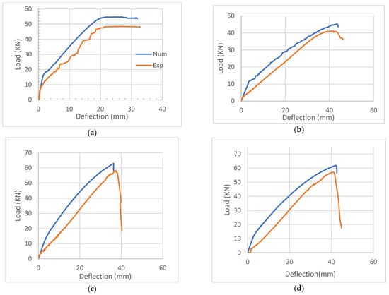 The load-deflection curves depicted in Figure 24 show a good match with the experimental results. Table 10 presents a summary of numerical results. Additionally, Table 10 displays the percentage of change in the numerical results when compared to the experimental and theoretical results, with regards to the ultimate load and maximum deflection, respectively.