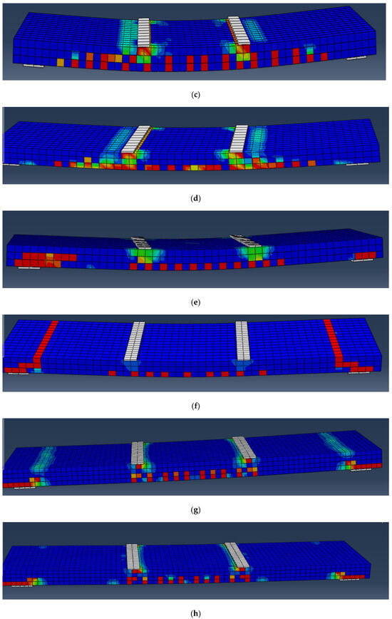 Failure mode for slabs using FE model: (a) CS1-N; CS2-N; (b) CS 3-ETS; (c) RS-R-D10; (d) RS-R-D20; (e) RS-St-D10; (f) RS-St-D20; (g) RS-Sh-L1; (h) RS-Sh-L2.