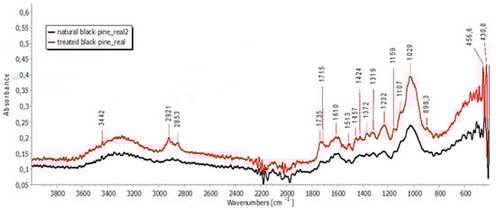 Furthermore, the spectra of the peaks at 1460 cm−1 and 1420 cm−1 showed a notable difference. Based on the literature, it is expected that the peaks of absorption found at 1460 cm−1 and 1420 cm−1 will rise after thermal modification [].