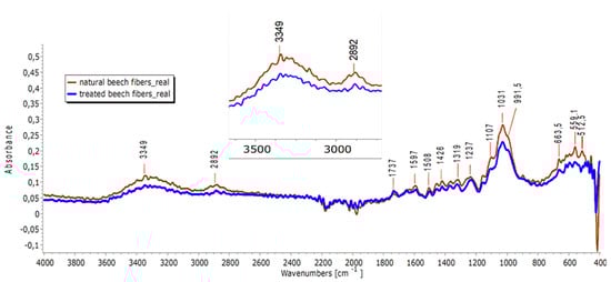 Even though in this study there is no reference to untreated wood fibres, a comparative analysis of treated and untreated fibres’ chemical composition was performed to understand the role of hydrothermal modification on their properties. According to the spectroscopic analysis of unmodified and thermally modified black pine and beech wood fibres derived from FTIR-ATR spectroscopy, an intense variation in the anatomical characteristics, chemical compounds, chemical bonds and structural characteristics between the untreated and treated black pine (Figure 1) and beech (Figure 2) wood fibres were not detected (neither derived from the treatment nor from the different species). The peaks of spectra were found to be fairly typical, indicating that wood bears the same functional groups and wood bond types among species, which result in various vibrations upon contact between the wood fibre and the light bundle. Although the different bands that correspond to different characteristics of wood groups (aromatic rings, double-bonds, carbon chains, carbonyls, hydroxyls, absorbed moisture, etc.) were examined, differences between the spectra of treated and untreated wood are challenging to identify and complicated to assess, as there are numerous interactions in wood constituents that occur simultaneously during the thermal treatment process [].