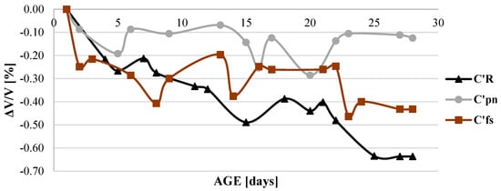 Volume deformations of the produced mortars (C’R: reference/unreinforced mixture, C’pn: reinforced mixture with black pine fibres, C’fs: reinforced mixture with beech fibres).