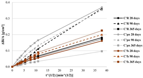 The capillary absorption of the specimens is affected both by the addition of biofibres (depending on the wood species) and their hardening time. According to Figure 5 and Figure 6, it appeared that the reference mortars maintained their tendency towards a stable capillary absorption over time (referring to the first and final measurements), although from 28 to 90 days, there was an increase of about 82% in the capillary water absorption coefficient (C). This increase is probably related to the porosity increase and the formation of the shrinkage cracks mentioned previously, which amplifies the communication of the internal micropores. This tendency was balanced during maturing when the hardening products reduced the voids and diminished their interconnection []. Examining the fibres’ performance, the two reinforced mortars behaved differently. As presented in Figure 5 and Figure 6, the C’pn case displayed a decreasing absorption inclination through ageing, with lower water absorption values than those of the reference case at the age of 365 days (a −50% variation of the C value). In contrast, the C’fs case presented a rising trend through maturing, recording shorter capillary curves than the reference composition between 28 and 90 days of hardening. Apparently, the voids/pores connection system was affected by the mortar’s porosity and hydration process of cement since their interaction was impaired in the pn case (the porosity remained stable, but the hydration products minimised the pores’ connections) and improved in the fs-type (the porosity was decreased, but interconnected micropores may be formed). A rational explanation probably arises from the fibre structure, which affects the interaction zone of the fibre–cement matrix and contributes to the formation of the mortar capillary systems.