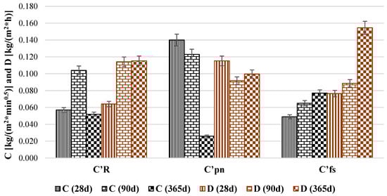 Capillary water absorption coefficient (C) and drying rate for the first 24 h of drying (D) of the cement mortars at the ages of 28, 90 and 365 days (28 d, 90 d and 365 d).