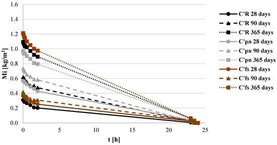 Finally, by examining the specimens’ drying curves (Figure 7), it was observed that all different material samples became less dense during maturing as the drying phases became longer. The specific behaviour was related to the porosity values of the C’R and C’pn cases and to the capillary absorption tendency of the C’fs composite category. Concerning the effect of the wood fibres in the mortar drying procedure, it appeared that at early ages (28 days), the presence of fibres boosted the drying action of the cement mortars (with the reference case being the densest), while after 365 hardening days, the C’pn mortars became the densest (which displayed the lowest capillary absorption coefficient at this age). On the other hand, after 365 maturing days, the C’fs case showed the highest drying rate, which corresponded to an increase of about 34% compared to the reference composite category (Figure 6).