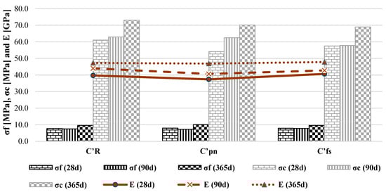 Flexural strengths (σf), compressive strengths (σc) and dynamic moduli of elasticity (E) of the produced mortars at the ages of 28, 90 and 365 days (28 d, 90 d and 365 d).