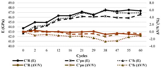 Evaluating the E and volume deformation curves of the cement mortars during artificial ageing (Figure 9 and Figure 10), similar modification trends of the slope were observed between the reference and the fibre-reinforced samples under both weathering conditions. Extensive analysis revealed that, at the freeze–thaw cycles, the C’R and C’fs samples presented similar E values, with the C’pn values being the lowest ones. Nevertheless, in relation to the volume deformation, the C’R and C’pn compositions displayed the highest dimensional stability. The gradual increase in the specimens’ dynamic moduli of elasticity indicated the evolution of the cement hydration process at these first stages of freeze–thaw cycles, which overcame the freeze–thaw effect due to the phase change in the water inside the material’s voids []. Moreover, the fibres’ role was probably not significant yet since the deterioration process was not fully developed []. According to the curves of the mortars for the outdoor exposure, the fs-reinforced samples case displayed the most stable E behaviour regarding the changes amongst subsequent time moments. Furthermore, regarding the dimension deformations, the C’R and C’fs presented higher volume stabilities than the C’pn. Under specific severe exposure conditions, where constant temperature, humidity, ultraviolet (UV) radiation, CO2 subjection and air changes interacted [,], it seemed that the porosity values and the void connections affected the material properties. Hence, the fs-fibre-reinforced mortars, with a similar porosity to the R samples case and the lowest capillary absorption at the age of 90 days (the beginning of the cycles), improved the cement mortar behaviour, while the humidity absorption and movement were probably minimised.