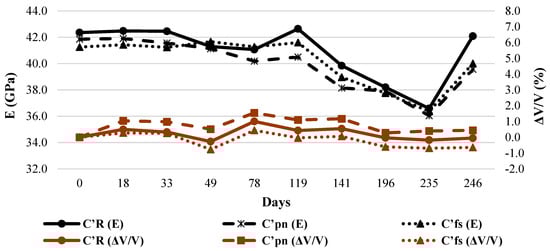 Finally, Figure 8 displays the samples’ dynamic moduli of elasticity (E) throughout one year of ageing. The results revealed an improvement in the mortars’ rigidity during hardening, which responded to the compressive strength evolution []. The specific increase was equivalent to 19%, 25% and 16% from 28 to 365 days for the cases of C’R, C’pn and C’fs, respectively. Furthermore, the addition of black pine fibres contributed to a reduction in the mortars’ E values, while as time passed by, this differentiation was normalised until the 0.8% decrease at the age of 365 days. In contrast, the beech fibre-reinforced samples presented similar values to the reference composition through all maturing times. This behaviour of fibre-reinforced mortars was probably affected by the fibres’ E value and the composite structure. More specifically, it has been proved that the saturated fibres’ E value is a scale lower from the corresponding dry state, which negatively affected the mortar’s modulus of elasticity. Moreover, the existence of flaws, namely voids and microcracks, in the mortar structure also reduces its stiffness [].