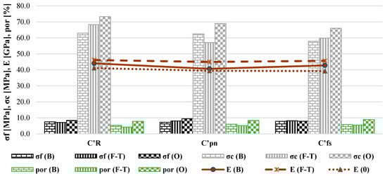 Flexural strengths (σf), compressive strengths (σc), dynamic moduli of elasticity (E) and porosity (por) of the produced mortars before the start of cycles (B) and at the end of the freeze–thaw cycles (F–T) or outdoor exposure (O).