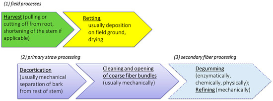 Initially, it seems sensible and expedient to consider and describe the process chain for the provision and processing of bast fiber plant material according to the individual steps. According to our proposal, distinction should be made among field processes, primary processing and secondary (or further) processing (Figure 3).