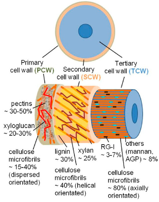 Schematic illustration of the layers in elementary fibers [51]. (Originally published in: Key Stages of Fiber Development as Determinants of Bast Fiber Yield and Quality. Under CC BY 3.0 license. Available from 10.3390/fib6020020); RG-I—Rhamnoglalcturonan I; AGP—Arabinogalactan.