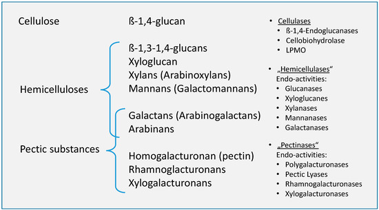 Structural (left) and molecular cell wall components (middle) and enzymes (right) responsible for their decomposition (adapted from Kühnel [57]).