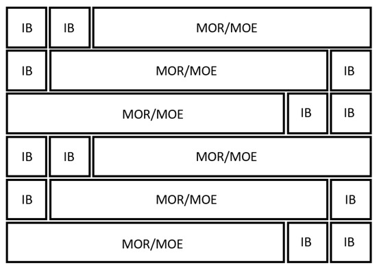 Cutting plan applied for BT 1 to BT 4. (IB = internal bond strength, MOR = modulus of rupture, MOE = modulus of elasticity).