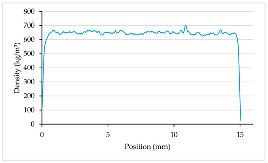 To confirm that the board preparation process yields boards with uniform density profiles, three samples measuring 50 × 50 × 15 mm were cut from each board. The samples were taken from the edges of the examined bending specimens, and density scans were performed.