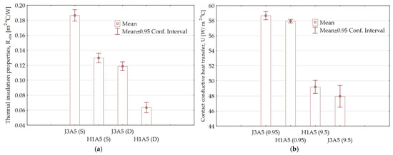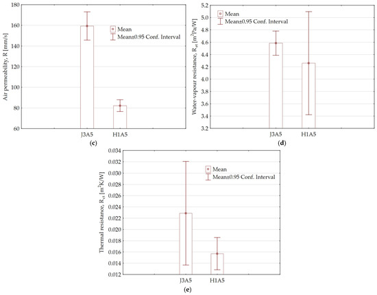 Graphical representations of the measurement results for H1A5 and J3A5 systems: (a) The thermal insulation in static and dynamic mode; (b) Contact conductive heat transfer in uncompressed state (0.95 N) and compressed state (9.5 N); (c) Air permeability; (d) Water vapour resistance; (e) Thermal resistance.