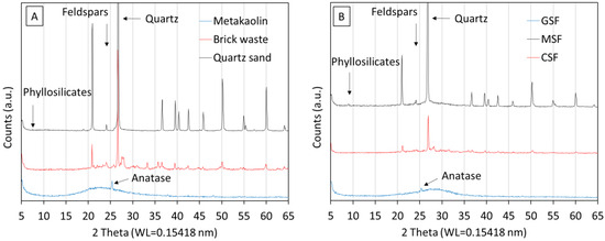 In Figure 2, the X-ray powder diffraction (XRPD) spectra of both raw materials and products are reported. The X-ray diffraction (XRD) analysis performed on metakaolin revealed its predominant amorphous structure, with a minor presence of anatase attributable to the inherent impurities within the raw material. Conversely, the XRD patterns obtained from both the sand sample and brick waste underscored the quartz-rich composition of the former and a very low occurrence of carbonates within the latter. Considering the intended application in mortar formulations, it is imperative to note that quartz sand was used instead of river sand to improve acid resistance. Conversely, the scarce presence of carbonates within the brick waste, despite being of low concentration, may generate challenges due to their inherent susceptibility to acid-induced degradation.