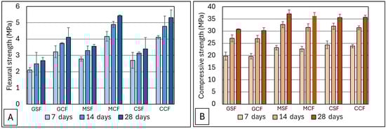 (A) Comparative values of flexural strength for geopolymers without and with coconut fibers (GSF and GCF, respectively), geopolymeric mortar samples with quartz-rich sand without and with coconut fibers (MSF and MCF, respectively), and geopolymeric mortar samples with crushed waste bricks without and with coconut fibers (CSF and CCF, respectively). (B) Comparative values of compressive strength for geopolymers without and with coconut fibers (GSF and GCF, respectively), geopolymeric mortar samples with quartz-rich sand without and with coconut fibers (MSF and MCF, respectively), and geopolymeric mortar samples with crushed waste bricks without and with coconut fibers (CSF and CCF, respectively).