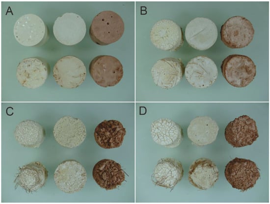 Comparative images of geopolymers (on the left in the pictures) and geopolymeric mortar samples with quartz-rich sand (in the middle in pictures) and brick waste aggregate (on the right in the pictures) after water absorption at atmospheric pressure (A) and immersion in 10% citric acid (B), 10% hydrochloric acid (C), and 10% sulfuric acid (D) for seven days, showing the degradation patterns.