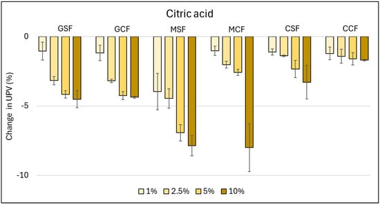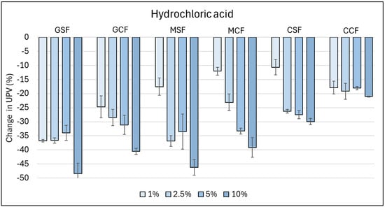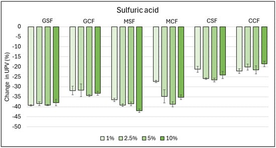 Mass changes of the samples exposed to solutions of citric, hydrochloric, and sulfuric acid for 7 days at, respectively, 1%, 2.5%, 5%, and 10% concentrations.