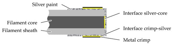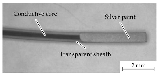 After the core of the filament is exposed through cutting, it is dipped 4 mm in silver paint, covering the cut surface as well as the insulating sheath material. The silver paint used in this work is from the company MARAWE GmbH & Co. KG, Regensburg, Germany. A microscopic image of a cut and silver-painted filament can be seen in Figure 3.
