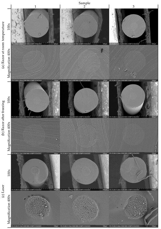 Direct comparison of razor and laser-cut samples; (a) razor at room temperature, (b) razor after freezing, and (c) laser.