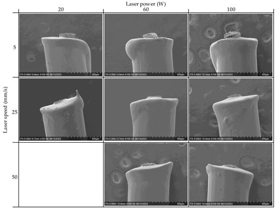 After evaluation of the cutting pretrials, the parameters of the laser cutting machine are investigated in order to determine if they have an influence on the quality of the cut surface and, therefore, on the electrical contact. For this purpose, the laser speed and laser power are varied. A 22 fully factorial design of experiments (DOE) was planned, but the combination of the highest speed with the lowest power (50 mm/s and 20 W) was not able to cut through the filament. This is thought to be due to the fact that enough energy cannot be transferred to the filament in the short contact time. The resulting parameters tested are shown in Table 3. As a consequence, 2 22 DOEs are analyzed: (1) 5 vs. 25 mm/s and 20 vs. 100 W, and (2) 5 vs. 50 mm/s and 60 vs. 100 W. The qualitative results from the SEM images are shown in Figure 5 and Figure 6.