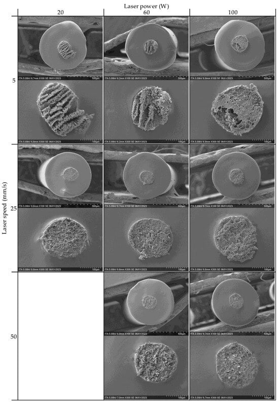 Lastly to be investigated from the cross-sectional images is the small tail visible in the samples cut at 25 mm/s and 20 W, which is also visible in the longitudinal images (Figure 14). This may result from the relatively fast but low-energy input of the laser. There is not enough time for the sheath material to be fully and cleanly cut and the remaining “tail” is broken after cutting. This would also explain why cutting with even higher speed was not possible at the lowest power (50 mm/s and 20 W). The even higher speed and less dwell time for cutting resulted in an uncut filament, which was macroscopically visible.