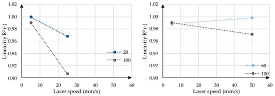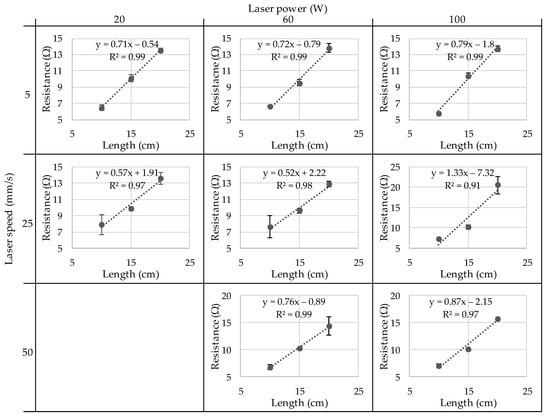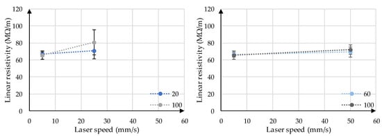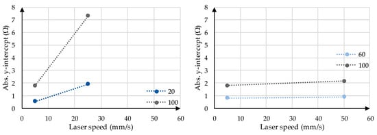 In Figure 7, it is observable that all the samples tested are relatively linear and that the data, when extrapolated to 0 cm, also tend towards 0 Ω. This is important because a non-zero y-intercept points towards either a contact resistance between the interfaces or inhomogeneous filaments and contacting method. This can be seen in Figure 9 and Figure 10 for the y-intercept as well as the linearity R2. It can be generally said that both a lower laser speed and lower laser power lead to a smaller y-intercept. The lower speed and power additionally lead to a higher linearity, with the exception of 5 mm/s and 60 W, although the R2 of 0.9881 is already very close to the ideal 1.0. Because these values, y-intercept and linearity, are calculated using all data points per sample, there is no possibility to calculate the significance with a t-test, and, therefore, only the trend of the data, but not the significance of the data, can be concluded.