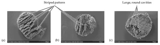 When analyzing the cross-sectional SEM images of Figure 5 and Figure 6 some qualitative characteristics can be observed. In only evaluating the 3 samples cut at 5 mm/s, all have larger and deeper cavities in the core component in comparison to those cut at the higher laser speeds of 25 and 50 mm/s. This is thought to result from the relatively long dwell times of the laser while cutting. Additionally, among the 3 samples cut at 5 mm/s, a difference can be seen from the lower to the higher laser power. At lower powers, the core has a striped visual effect, whereas the core cut at the higher powers has a more irregular pattern and rather larger, rounder cavities (Figure 13). It is thought that the regular striped pattern at the lower laser powers results from the pulsing of the laser while moving and cutting the material. These cavities may represent the removal of the CNTs, TPU, or both. On the other hand, at higher power (5 mm/s and 100 W), the amount of energy input is so high and the dwell time is so long (due to the slow speed) that the delicate structures remaining at the lower powers are destroyed, leaving larger vacancies in the core. This hypothesis would need to be further investigated in future research.