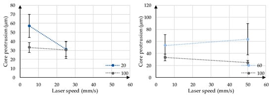 With analysis of the longitudinal images, other conclusions can be made. It can be seen that the cores of the samples cut at low speeds (5 mm/s) protrude more from the sheath than the samples cut at higher speeds (25 and 50 mm/s). This dependence of the protrusion on the laser parameters can be seen in Figure 15.