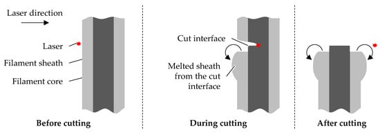 This could be explained by different melting characteristics of the sheath material during cutting due to different thermal properties. It is thought that the cut height of the laser is in line with the residual core component and not in line with the remaining sheath. The material at the cut interface is burnt away and material near the interface melts due to residual heat. This melting causes the sheath to retract and collect around the solid sheath. This is shown schematically in Figure 16. This phenomenon can also be observed in the laser processing of carbon fiber-reinforced plastics (CFRPs), where there is a heat-affected zone of carbon fiber and polymer matrix [].