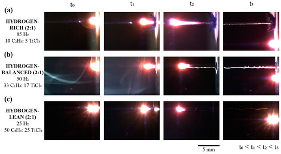 Series of time-lapse images for the 2 C2H4:1 TiCl4 mixtures with hydrogen for the TiC fiber growth. (a) Hydrogen-rich (b) Hydrogen-balance and (c) Hydrogen-lean mixtures.