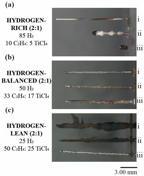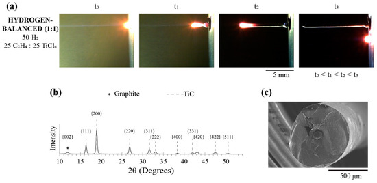Titanium oxide is known to exhibit a bronze color at low temperatures and a white color at higher temperatures [34]. The hydrogen-balanced (1:1) fibers exhibited a varying temperature gradient as it deposited, which was visible in Figure 7a, and where such thermal gradients would have created convective motion of the gases around the fiber that would lead to the oxidization of titanium. As these colors were not present in the hydrogen-balanced (2:1) condition, this mixture would have less available reduced titanium to react with any partial oxygen pressure that remained in the chamber after evacuation. While the XRD scan does not diffract the titania phase for either hydrogen-balanced mixtures, this simply indicates that titanium oxide is a minimal phase fraction and/or, more likely, a surface oxide scale. Since more titanium is being reduced in the 1:1 condition coupled with less available carbon, along with titanium’s high affinity for oxygen, these fibers were more likely sensitive to the partial pressure of oxygen that was in the evacuated chamber.