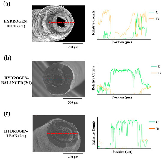 As seen in Figure 5a, the SEM image for the hydrogen-rich (2:1) condition has a notable hole in the fiber core forming it as a tube. An X-ray Energy Dispersion Spectroscopy (XEDS) line profile across the diameter is plotted alongside this image, where the relative carbon counts are zero in the hole region. While there is a modest Ti X-ray signal in this same region, this contributed to the Ti X-ray signal being collected from the inner core walls of the tube and escaping through the hole. This is further affirmed by the asymmetric count profile of this signal in this region based on the tilt of the fiber to the imaging electron beam shown in the same figure. The lack of carbon X-ray emissions from the same off-axis collection is contributed to its much lower emission energy, as compared to Ti, resulting in it being absorbed and unable to escape through the hole. Note that equivalent hole structure has also been reported by Fronk et al. in TiC fibers [19]. This hole morphology is explained by the aforementioned Soret effect, where the hydrogen gas, at a sufficiently high concentration, excluded the heavier precursor species from the central region under the laser focal point. Consequently, the solid TiC phase was only able to be deposited radially around the gaseous center creating this tube.