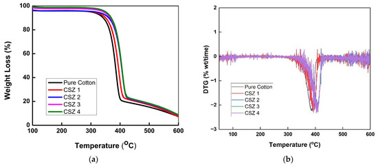 To further explore the thermal properties of FR-finished samples, coated and uncoated samples were examined by thermogravimetric analysis, and the corresponding results are shown in Figure 2a. All the samples show a similar trend of thermal degradation and completely degrade at 600 °C under nitrogen supply. Mostly, cotton fabrics tend to degrade in three phases. The first phase covers volatilization of cotton by converting it into volatile products. In the second phase, the main degradation of cotton samples takes place, leading to the third phase of carbonization [27]. The degradation of pure and FR-finished coated samples takes place between 350 °C to 450 °C, as shown in Figure 2b. It was noticed that the existence of SiO2 and ZnO in the prepared nano-sols results in improved thermal degradation. The pure cotton degraded earlier as compared to CSZ1, CSZ2, CSZ3, and CSZ4. Thus, SiO2 and ZnO coatings via sol–gel provide a protective layer on cotton, acting as a barrier against heat and oxygen. As a result, treated FR-finished samples show better thermal resistance as compared to pure cotton.