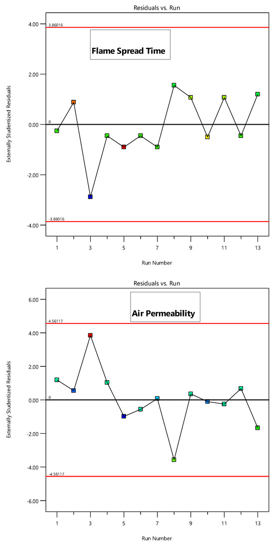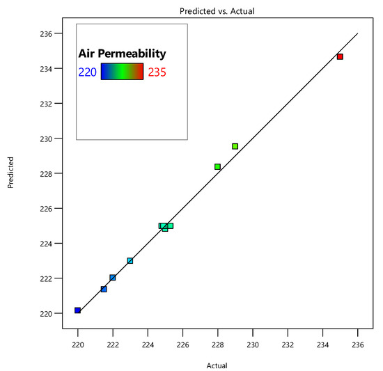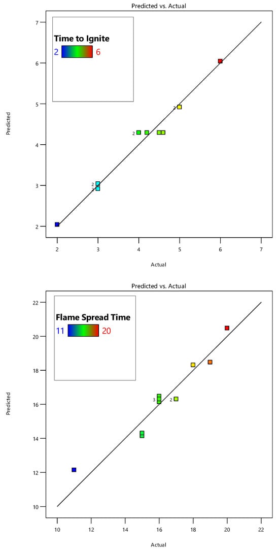 Equations (1)–(3) are reported in terms of coded factors, i.e., silica content (A) and ZnO content (B), for process responses, viz., time to ignite, flame spread time, and air permeability. The process responses at any given level of factors can be assessed using these equations. Analysis of variance (ANOVA) for time to ignite, flame spread time, and air permeability was also carried out as shown in Table 5, Table 6 and Table 7. ANOVA results show that all model terms are significant, since p-values are less than 0.0500 for the developed regression models [18]. The F-values for time to ignite, flame spread time, and air permeability are 56.76, 56.67, and 301.80, respectively, which also shows the accuracy of the models. A greater F-value shows the significance of the model [35]. Finally, the coefficient of determination, i.e., R2 value, can be used to test the fitness of the models. The R2 and adjusted R2 values for time to ignite, flame spread time, and air permeability are in the range of 0.90–0.99, as shown in Table 5, Table 6 and Table 7. This shows a good fit between the experimental and model data [36]. Finally, the lack of fit is not significant for all models, which shows that the predicted data fit well against the experimental data. The comparison between actual vs. predicted values for time to ignite, flame spread time, and air permeability for pure and treated cotton samples is shown in Figure 3. The graphs show a good distribution of data points along the diagonal line, which shows the suitability of the developed regression models for silica and ZnO coating process using the sol–gel method.