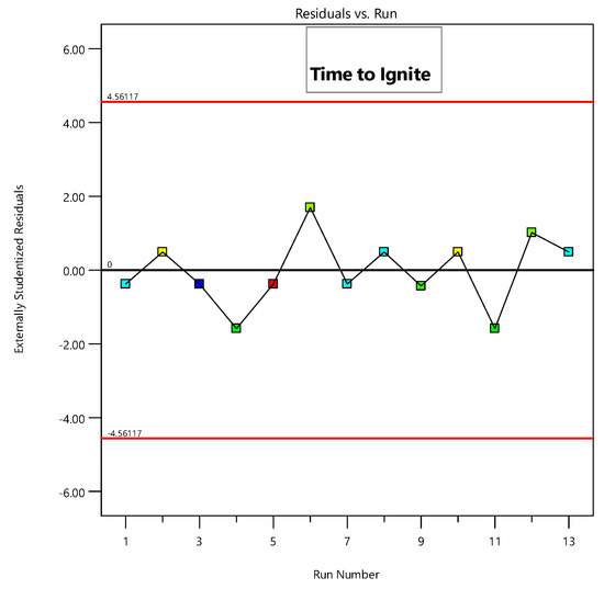 The residual plots versus the experimental runs are shown in Figure 4. From all residual plots, it is evident that the data are randomly distributed along the estimated regression line at zero (0). There is no regular or unusual pattern in the residuals, which shows the effectiveness of the randomization process in the design matrix and suitability of the models [36].
