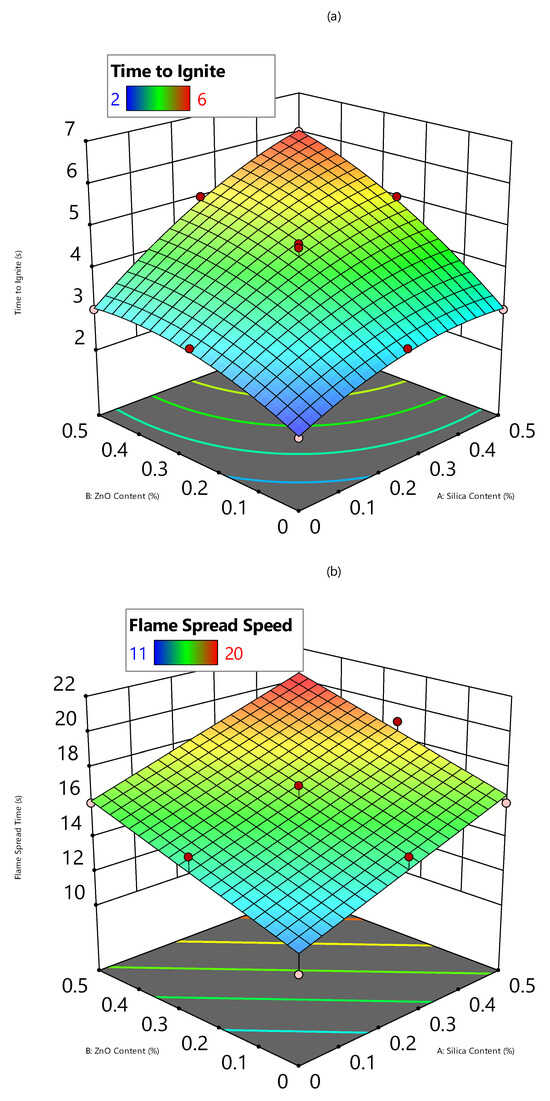 The data reported in Table 3 were used to develop the model Equations (1)–(3) using response surface methodology with a central composite design. These models were developed to estimate the effect of process parameters, i.e., silica and ZnO content, on process responses, viz., time to ignite, flame spread timing, and air permeability. By this statistical analysis, dominating, influential, significant, and non-significant factors can be determined for the optimization of the sol–gel coating process. The following equations can be used to predict and estimate time to ignite (Equation (1)), flame spread time (Equation (2)), and air permeability (Equation (3)) against silica and ZnO content for the development of cotton protective clothing:
