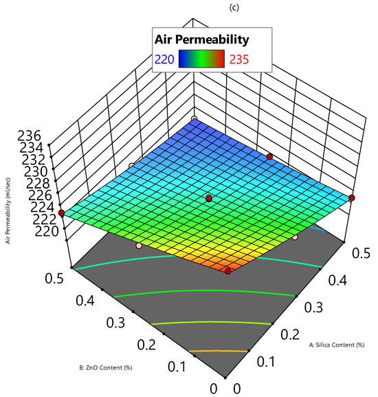 The effect of silica and ZnO sol–gel coating on time to ignite, flame spread time, and air permeability of treated cotton samples was evaluated, as shown in Figure 5a–c. With the increase in silica and ZnO coating, time to ignite increased as depicted in Figure 5a, which shows the delayed ignition of treated cotton samples. The 3D plot corresponds to the quadratic model (Equation (1)). The maximum time to ignite was noted at for 0.50% coating of silica and ZnO. A comparison of flammability properties with the previous literature is given in Table S1 in the Supplementary Materials. A similar trend was observed for flame spread speed, as shown in Figure 5b. However, in this case, a linear relation was observed in the 3D plot, which is also represented by a linear model (Equation (2)). Contrary to this, a decrease in air permeability was noticed for FR-treated samples because of the presence of silica and ZnO nanoparticles on the fiber. The nanoparticles hindered the air permeability by reducing the available transport sites in the fiber [37,38].