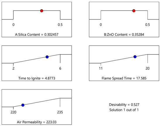 The process optimization of the coating process of FR cotton samples for protective clothing applications was evaluated by RSM models. From the effect of process parameters, it was observed that time to ignite and flame spread time have a direct relation with silica and ZnO concentration. On the other hand, air permeability has an inverse relationship with silica and ZnO concentration. Therefore, determining an optimum concentration of silica and ZnO nanoparticles or an ‘optimum design point’ is essential for the optimized protective properties. For the optimization analysis, ‘the-larger-the-better’ approach was adopted to determine the ideal cutting conditions by Design Expert® software (version 13, Stat-Ease Inc., Minneapolis, MN, USA) [39]. This criterion was selected because delayed time to ignite and extended flame spread time are preferred for FR protective clothing. Similarly, enhanced air permeability is required for better comfort properties. Under these constraints, the software proposed only one optimum solution or optimum design point, which is shown in Table 8. It was noticed that the maximum desirability was exhibited by flame spread speed, which was 0.731 for the overall optimization criteria, compared to other flammability and comfort properties, as shown in Figure 6. The air permeability showed the lowest desirability (0.20), which shows the complexity of the optimization problem. Therefore, the overall desirability value of the coating process under these constraints was 0.527. The ramp function graph shown in Figure 7 represents the suggested optimization results for process factors and process responses. The dot on the ramp shows the optimum level of each process factor and process response under the employed optimization constraints.