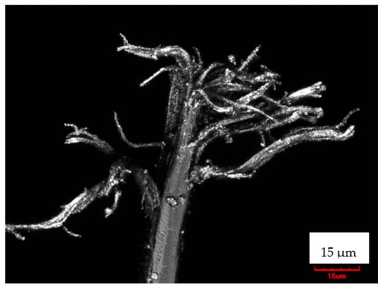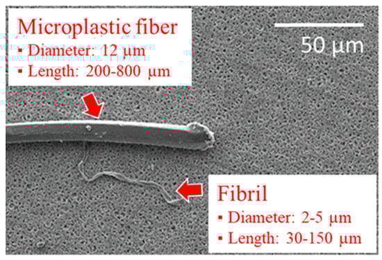 Fibrous microplastics are one of the main sources of deterioration in the environment on our planet. So-called primary fibrous microplastics are small fibrous particles (<5 mm in size) that include the fiber fragments released during the textile’s preparation and maintenance (washing and drying processes). This kind of fibrous microplastic is obviously more dangerous because it is stronger than partially depolymerized secondary fibrous microplastics. Secondary fibrous microplastics are polymeric particles released into environments due to the natural, time-dependent degradation/weathering of larger fibrous objects (e.g., fibrils extracted from fibers) [,]. Degradation is characterized by the shortening of polymeric chains and the loss of mechanical properties or integrity of fibrous microplastics.