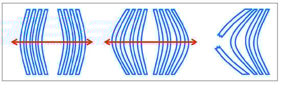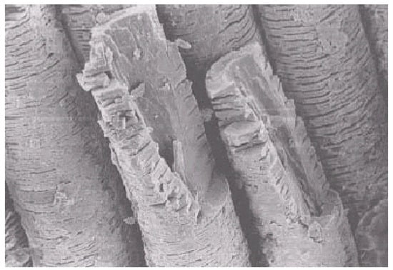 It was found that in the case of PET yarns, the filaments are stretched by periodic mechanical stress. Because of this stretching, filaments rupture successively. The proposed mechanism of repeated deformation is shown in Figure 9 [].