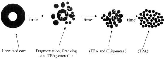 The resultant terephthalic acid (TPA) and ethylene glycol (EG) in hot water due to the hydrolysis of PET demonstrate differentiating properties. An increase in the protolytic constant is noticed as the temperature increases. More protons are available even in the absence of acid and base catalysts. A decrease in the dielectric constant of water with increasing temperature is observed. Hence, it is easier to dissolve organic molecules in hot water. The dissolution of TPA at elevated temperatures, which is almost insoluble at room temperature, becomes possible. On cooling the solution, the TPA is obtained by precipitation [].
