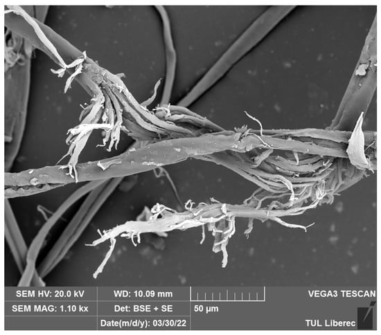 Abrasion is one of the main causes of the release of fibrous microplastics. Abrasion is catastrophic wear of fibers, yarns, and fibrous structures, which is the result of force contact (friction) of their surface with another surface (see Figure 7) [,]. As a result, abrasion causes a reduction in the material’s functionality, and it causes the formation of microplastics already in the first stages. Abrasion occurs during fibrous structure production, wear, use, and maintenance (especially washing). This action mechanically degrades fibrous structures, creates fiber breaks, and causes the fiber ends to be pulled off the surface or parts of the fibers to be removed [,].