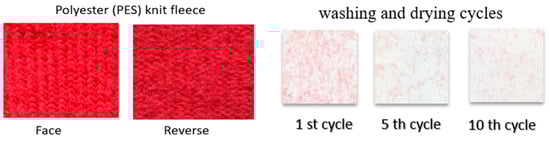 The amount of fiber fragments generated from washing is about 100 to 300 mg per kg of washed fabric []. The influence of home washing conditions on microplastics release was investigated in this work []. Based on the obtained empiric results, to reduce microplastics due to home washing, it is recommended to use detergent, improve washing machine filter size, and perform three industrial pre-washes. Just considering three pre-washes, the reduction in microplastics would range from 37% to 76%, depending on the type of fiber. For some special textile structures, like fleece fabrics, microplastics are generated in high amounts after repeated cycles of washing and drying, as shown in Figure 10.