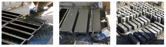 A tilting drum mixer of 0.25 m3 was used for mixing the ingredients. In a dry state, coarse aggregates, fine aggregates (II), and fine aggregates (I) were blended for 2 min with one-third of the water quantity to give the aggregates their need for absorption. Then, cement was added, followed by another one-third of the water gradually, and mixing continued. Following that, superplasticizers were dissolved into the remaining water and mixed for 5 min. Fibers were added as the last ingredient in the mix, gradually dropping them into the mixer and mixing for approximately 4 min.