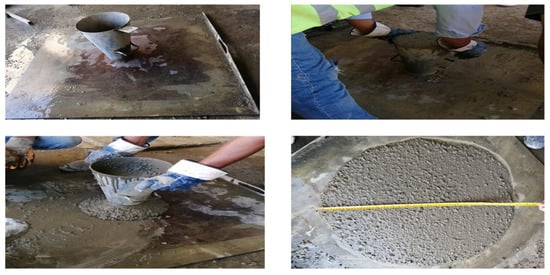 Before casting specimens, two different types of tests were conducted on fresh self-compacting concrete mixtures to determine the impact of adding basalt fiber on their fresh qualities in accordance with EFNARC [32]. The tests that were conducted were the V-funnel test and the slump flow test. Figure 3 and Figure 4 show the steps of the slump flow test and V-funnel test, respectively.