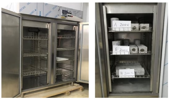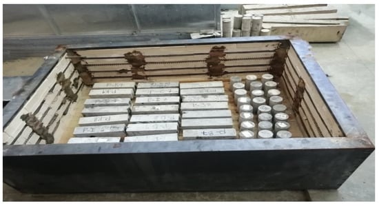 Over time, minor cracks in concrete elements become wider due to freezing and thawing in water. If the use of additives in the concrete mix is not stopped, the structure will experience permanent damage. According to ASTM C666-A [37], this test method assesses the resistance of concrete specimens to quickly repeated cycles of freezing and thawing in water (Procedure A). For each mixture, freeze-thaw resistance was assessed using cylinder specimens (100 mm × 200 mm) and prism specimens (100 mm × 100 mm × 400 mm). All specimens were placed in a freeze-thaw chamber after 28 days of curing and subjected to freeze-thaw cycles. The concrete specimens were frozen for two hours at (−18 ± 2) °C and thawed for one hour at +5 ± 2 °C. After being subjected to 100 and 200 cycles, compressive strength, splitting strength, and flexural strength tests were performed. Figure 6 shows the freeze-thaw chamber and the specimens inside the chamber.