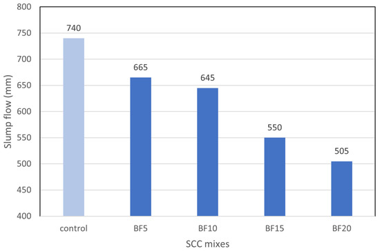 Slump flow test results for SCC mixtures with different basalt fiber contents.