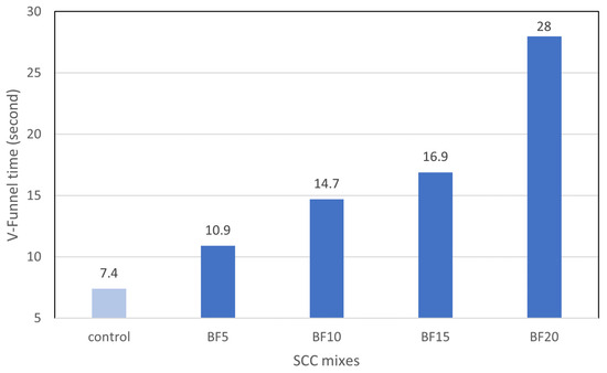 Table 6 and Figure 9 show that the V-funnel flow time gradually increases when the basalt fiber ratio in SCC mixes increases in comparison to the control mixture. Because fiber extends the amount of time required to flow mixes through the funnel, the V-funnel flow duration increases as the ratio of total volume of fibers increases. This was attributed to micro-scale particles of fibers absorbing some of the mixing water, enhancing the cohesiveness of fresh concrete as a result. It is clear that using BF at any ratio will cause SCC’s viscosity class to move to VF2 according to EFNARC flow time standards. At 0.2% basalt fibers, the maximum V-funnel time was 28 s. BF5, BF10, BF15, and BF20 had V-funnel flow durations of 10.9, 14.7, 16.9, and 28 s, respectively. This finding is consistent with a prior investigation by [15,27].