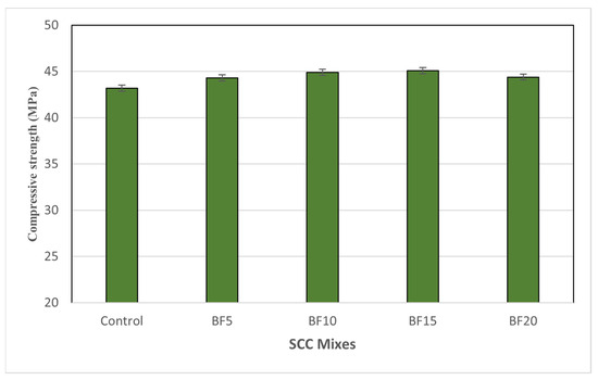 The results of the compressive strength of basalt fiber incorporation at different percentages are shown in Figure 10. As seen in Figure 10, adding basalt fibers did not considerably increase the compressive strength. In comparison to the control SCC specimen, the compressive strength of SCC at percentages of 0.05%, 0.1%, 0.15%, and 0.2% of basalt fibers increased by 2.6%, 3.9%, 4.4%, and 2.8%, respectively. The compressive strength decreased in the specimen with 0.2% of basalt due to the fact that the total surface area of the fibers significantly increases when the fiber content is extremely high. The bonding between cement pastes and aggregates deteriorates as a result of the requirement for additional cement pastes to surround the fibers [38]. This may possibly be because the introduction of fibers has reduced the density and workability of SCC. Similar results were reported by [11,13,14,18].